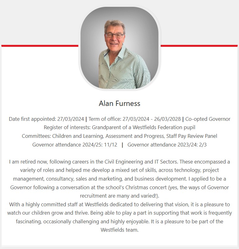 A Governors role is a time-consuming but rewarding role particularly as we are privileged to have such a committed and hard-working Headteacher and Staff. We advertise vacancies as they arise but feel free to contact me if you are interested in becoming a Governor.