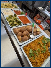 The school meals service provides a balanced and nutritious meal consisting of several choices of hot dishes, fresh vegetables and salads. Wholefood ingredients are used in the bread, pastry and pasta dishes. A pudding is also included.