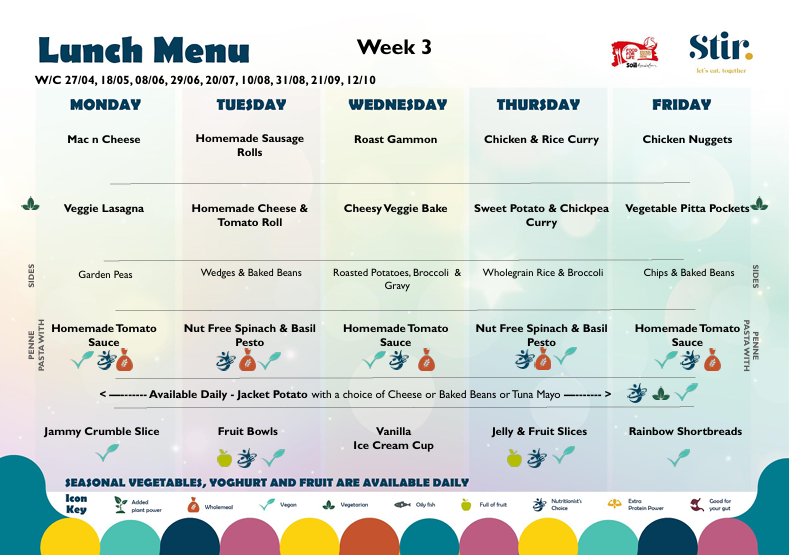 If your child requires a special menu or has any dietary requirement please click here and complete this form and return it directly to Stir Foods Ltd. Please also complete and return their Consent Form for a photographic image.